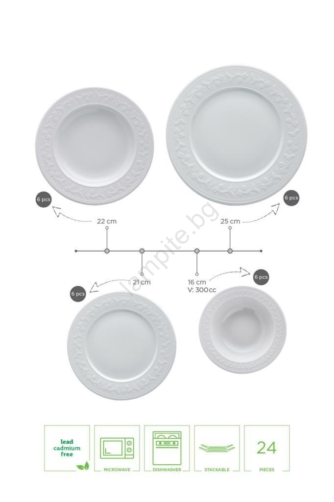 • Десертна чиния: 21 x 21 x 2 cm (6 бр.).