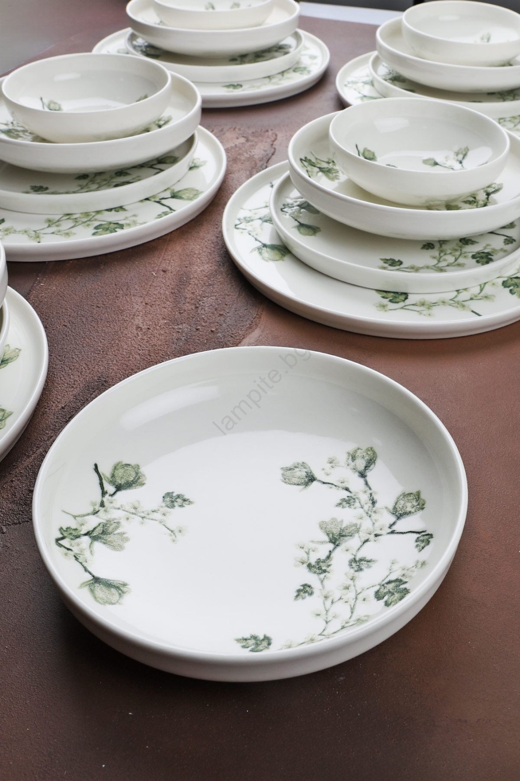 Сервиз за хранене 24 части, бял/зелен, порцелан