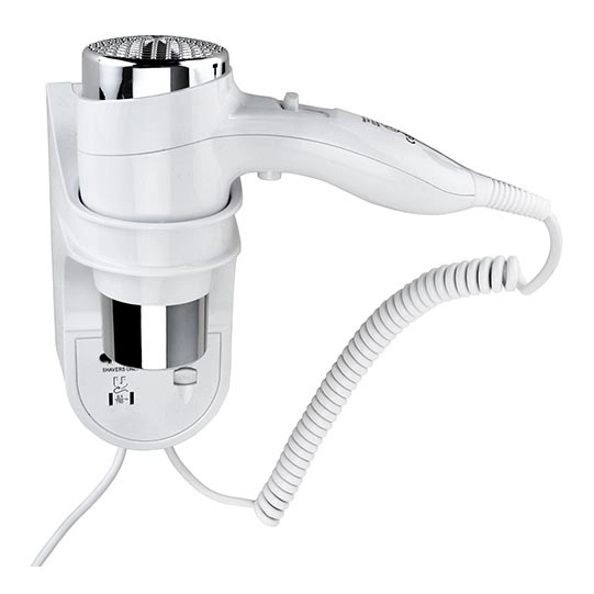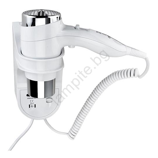 • Стенен сешоар с вграден държач за пестене на пространство в банята.
