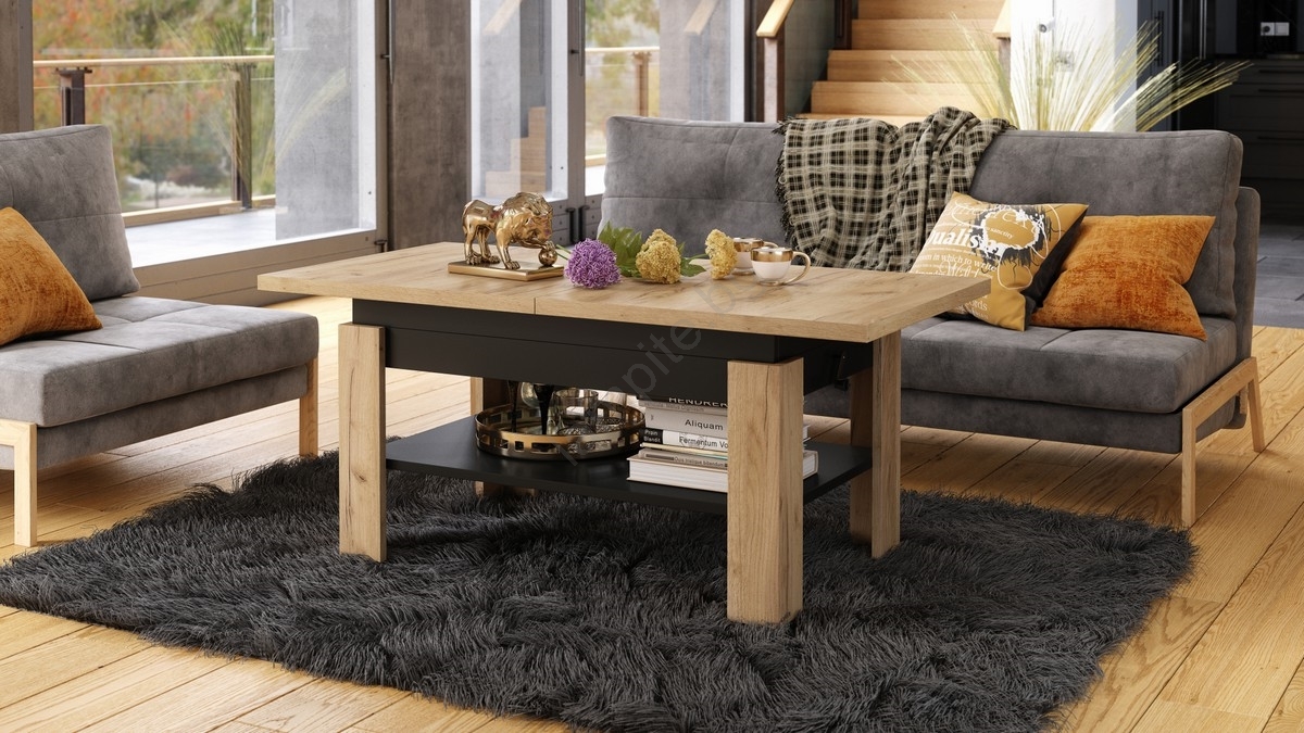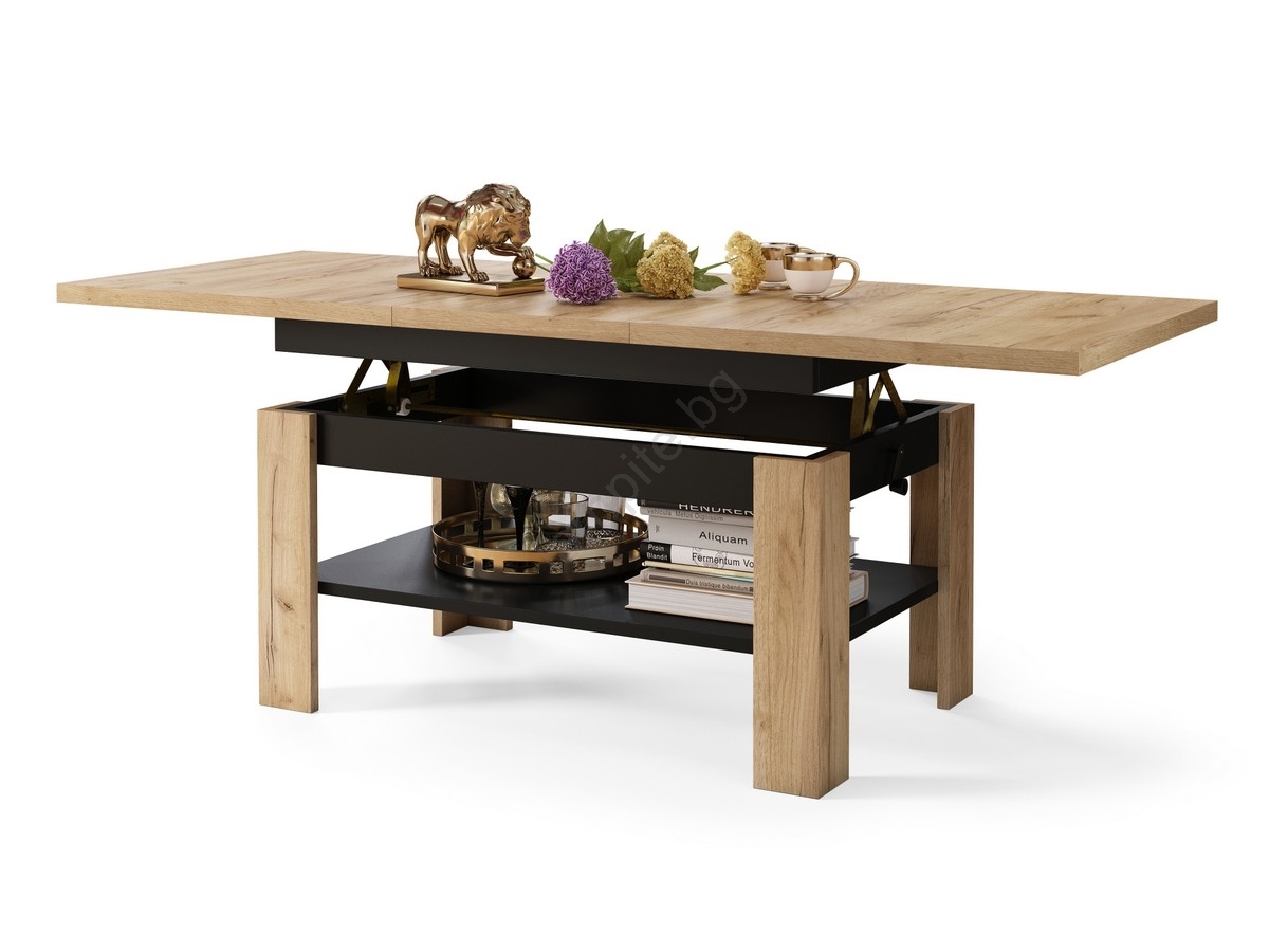 • Разтегателна холна/трапезна маса с повдигащ се плот ROY дъб крафт/черно