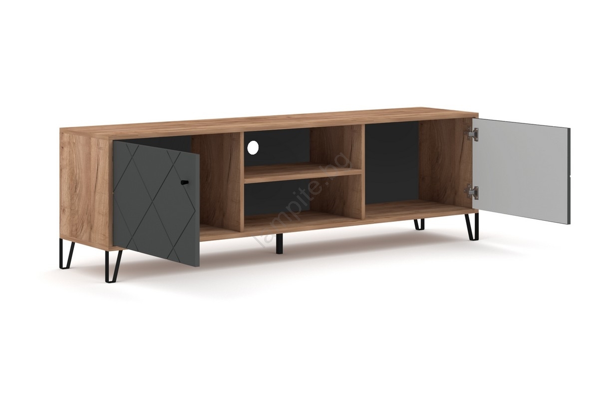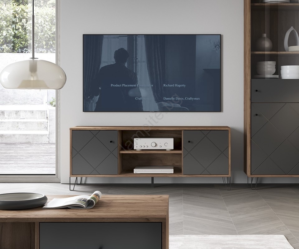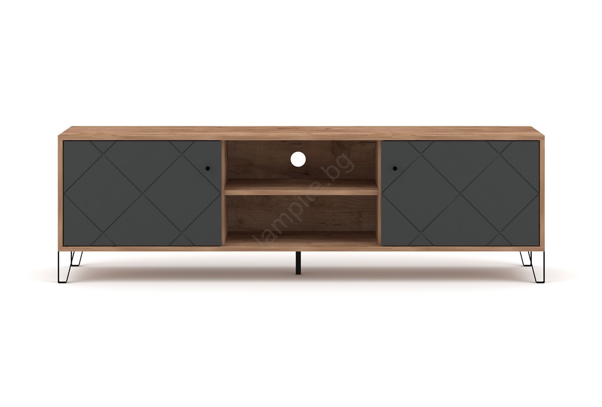 • Разполага с две затворени странични отделения, всяко с врата с декоративна диагонална украса, и две открити рафтове с отвор за кабели в средата.