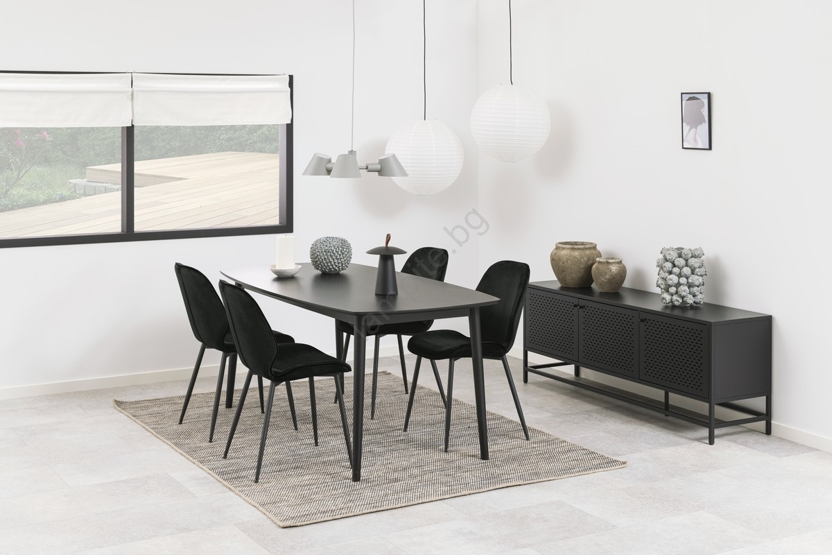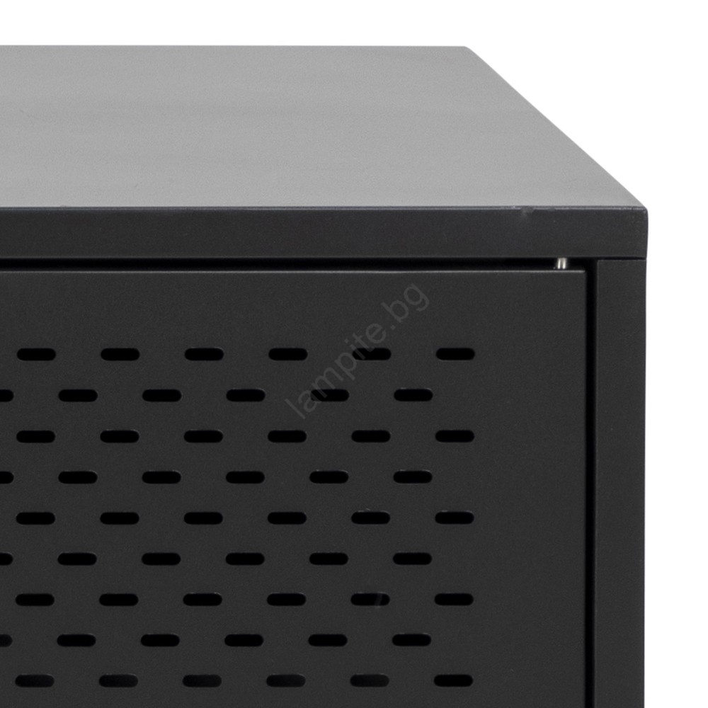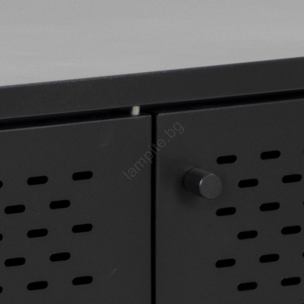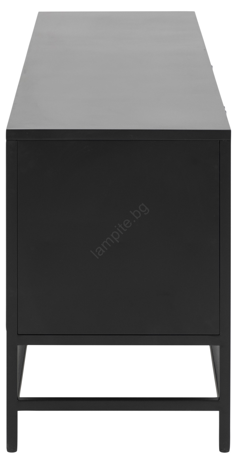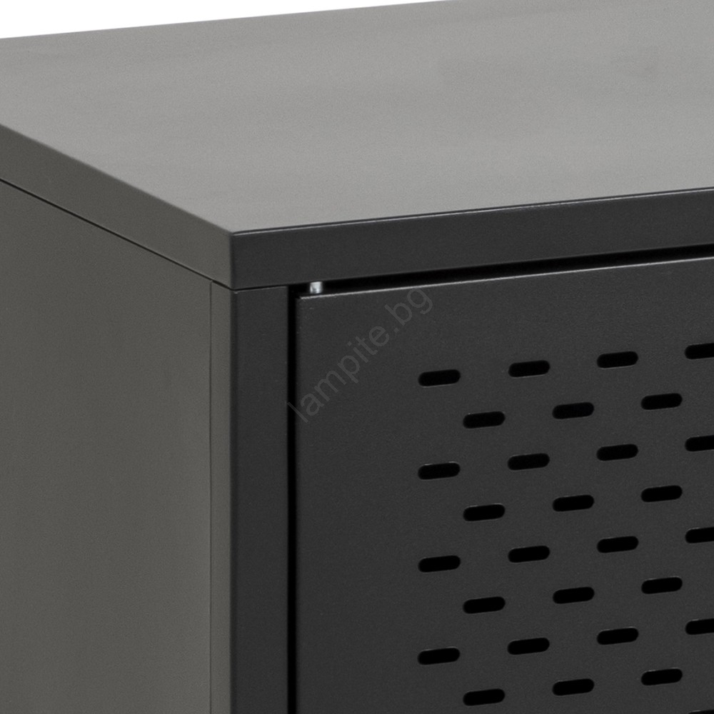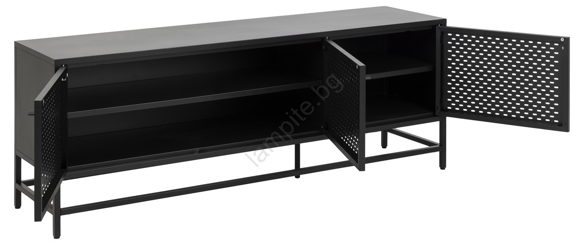 • Горен плот, рамка, 3 врати, 2 рафта и основа от матова черна, грубо прахово боядисана стомана.