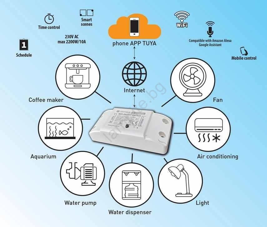 • Смарт едноканалният превключвател е предназначен за управление на уреди (вентилатори, нагреватели и др.) или осветление.