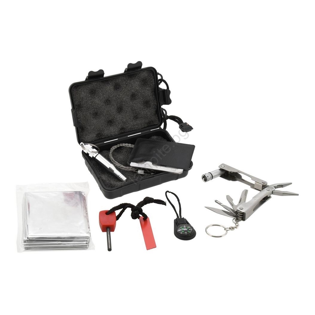 • Комплектът се състои от струна за рязане на дърва за огрев, картов мултифункционален инструмент, мултифункционални клещи с LED фенерче, компас, бивачно (изотермично) фолио, свирка, кремък и стомана за запалване на огън.
