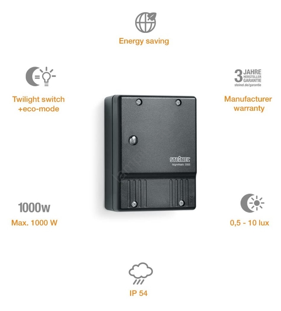 • NightMatic 3000 регистрира светлинните условия на околната среда и свързаните лампи включва вечер (след достигане на праговата стойност на настройката за здрач) и ги изключва при зазоряване.