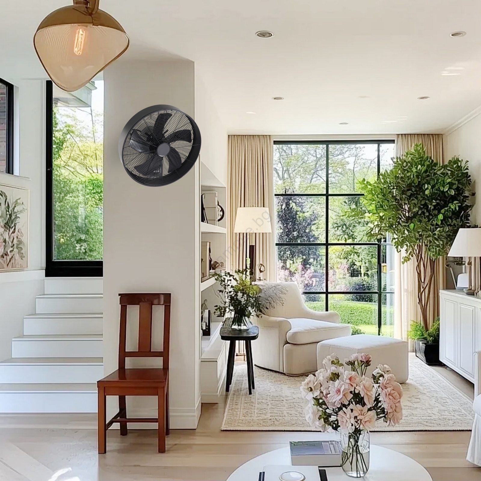 • Монтажът на вентилатора не изисква никакви строителни промени, просто закрепете вентилатора на стената и с удължителния кабел включете в контакт.
