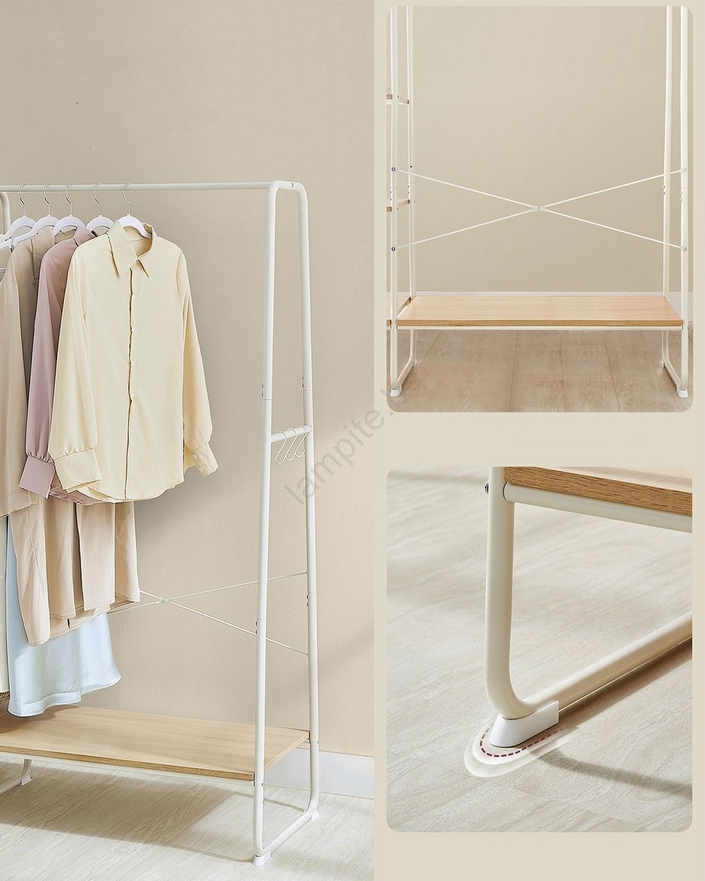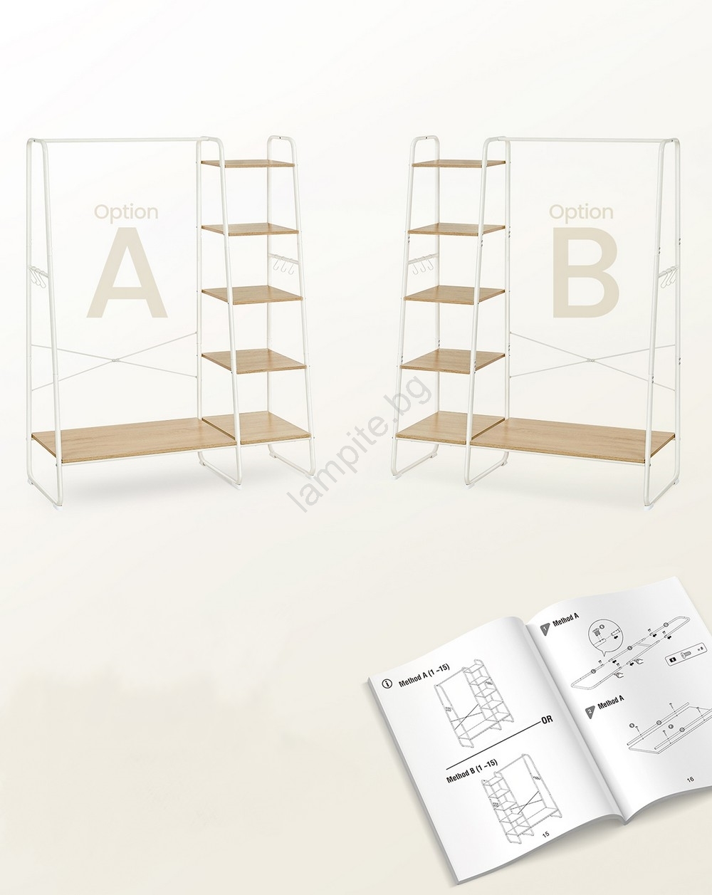 • Окачете якета, ризи и панталони на горната щанга по цялата й дължина, на 6-те рафта за съхранение подредете чанти, обувки, кутии,  шапки, шалове, чадъри и други необходими вещи.