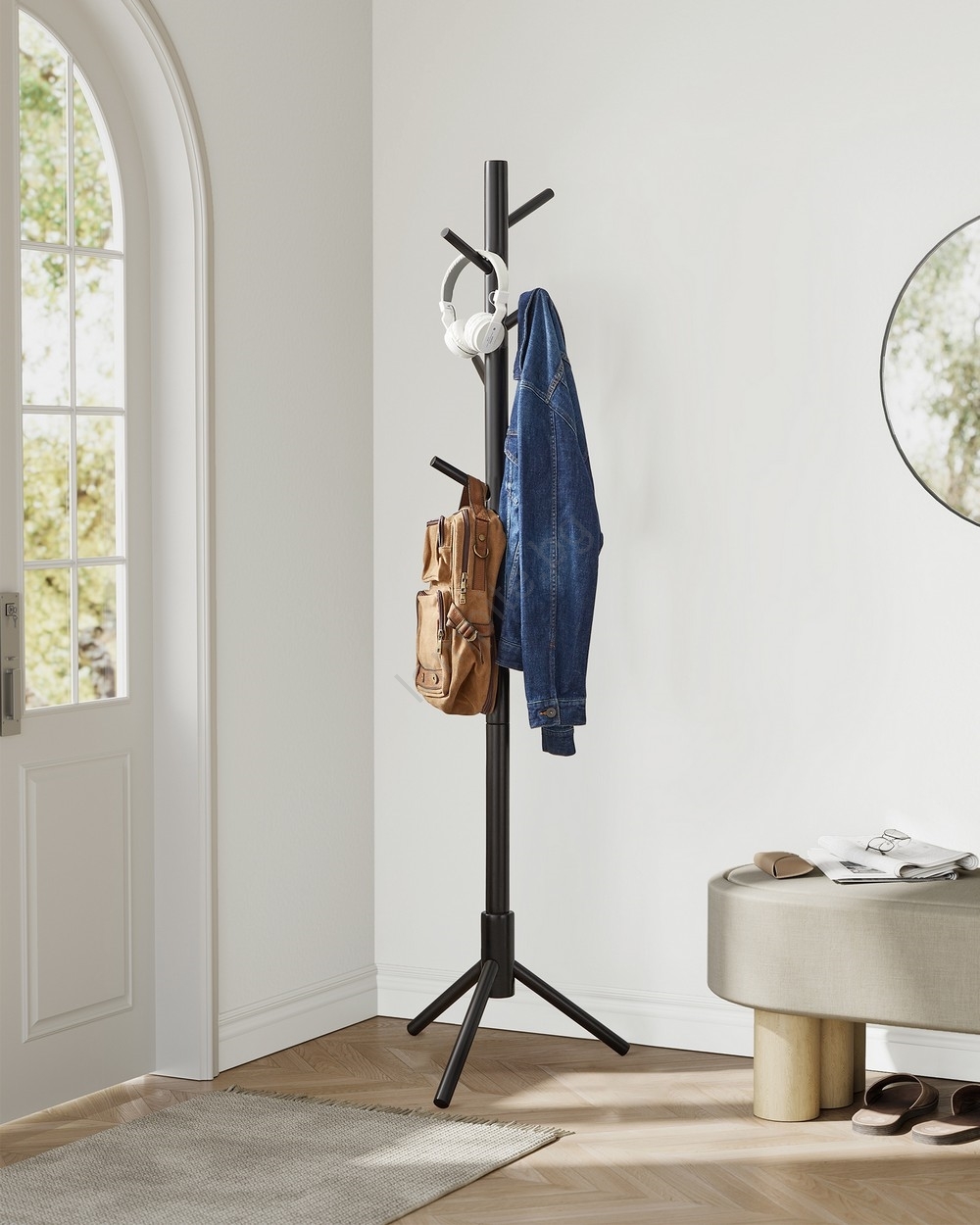 • С 8 заоблени куки на различни височини предлага достатъчно място за палта и чанти, за да се избегне препокриване.