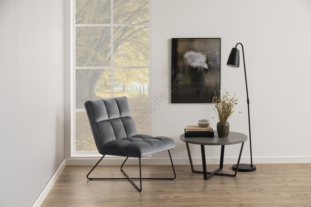 • Поради блясъка на кадифената тъкан, прахово боядисаната метална основа с кръстосан дизайн придава индустриален акцент на цялостния вид.