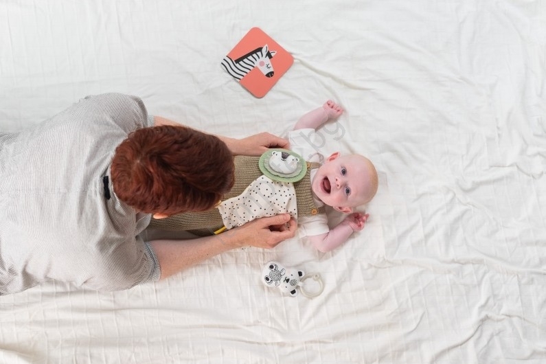 • Кутията за подаръци съдържа специално разработен комплект играчки за новородени, които забавляват бебето по време на игра по корем и подпомагат развитието на отделните му сетива и двигателни умения.