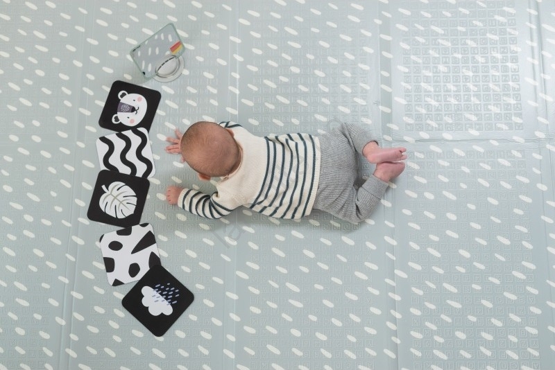 • Комплектът висококонтрастни картинки и безопасното огледало с две стойки също са проектирани така, че да се поставят пред бебето в позиция по корем.