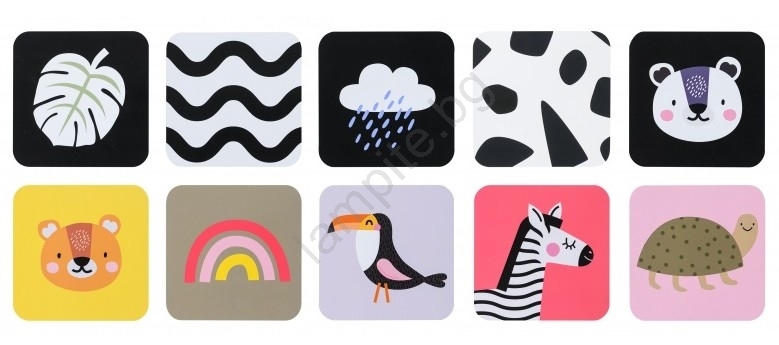 • 5 двустранни карти с 10 контрастни илюстрации.