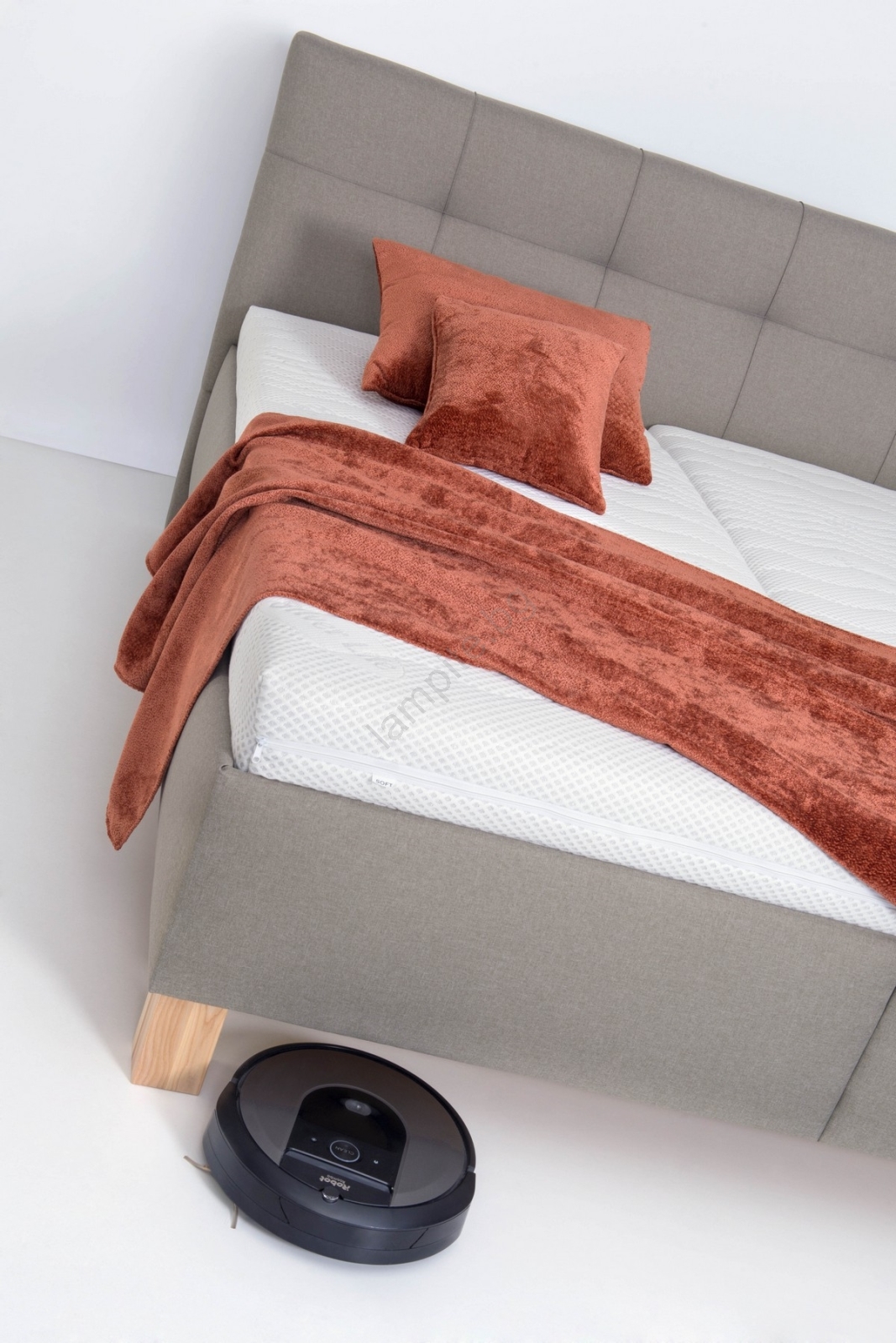 • Тапицирано двойно легло с отделно поставени матраци се отличава с внимателно оформено, елегантно прошито табло.