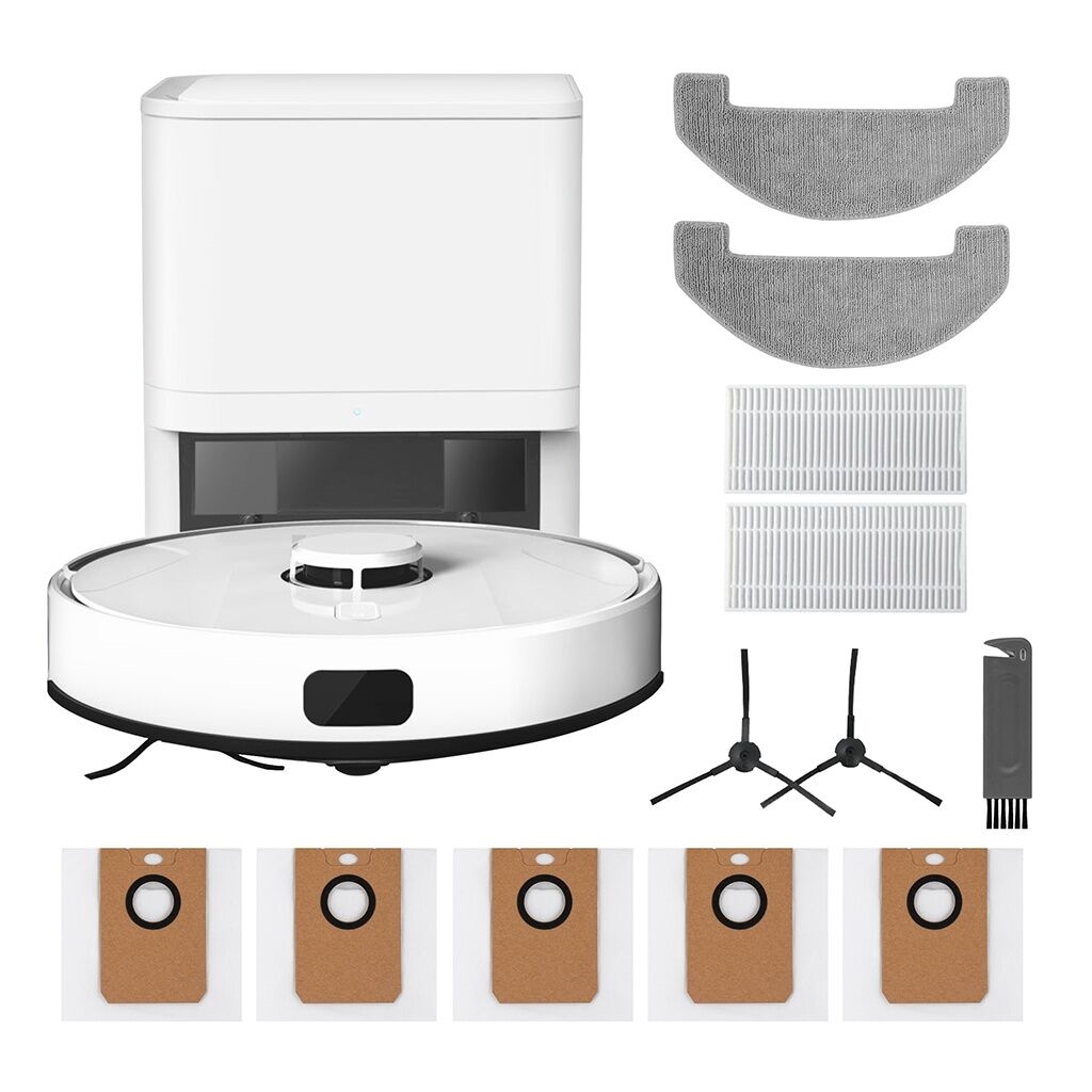 • Опаковката съдържа: лазерен роботизиран прахосмукач с автоматично изхвърляне на замърсявания, 2в1 резервоар за замърсявания и вода, зарядна станция с функция за автоматично изхвърляне на замърсявания, торбички за замърсявания за зарядната станция (5 бр.), странична почистваща четка (2 бр.), водно измиваем HEPA H13 филтър (2 бр.), микрофибърна моп кърпа (2 бр.), държач за моп, почистваща четка с ножче.