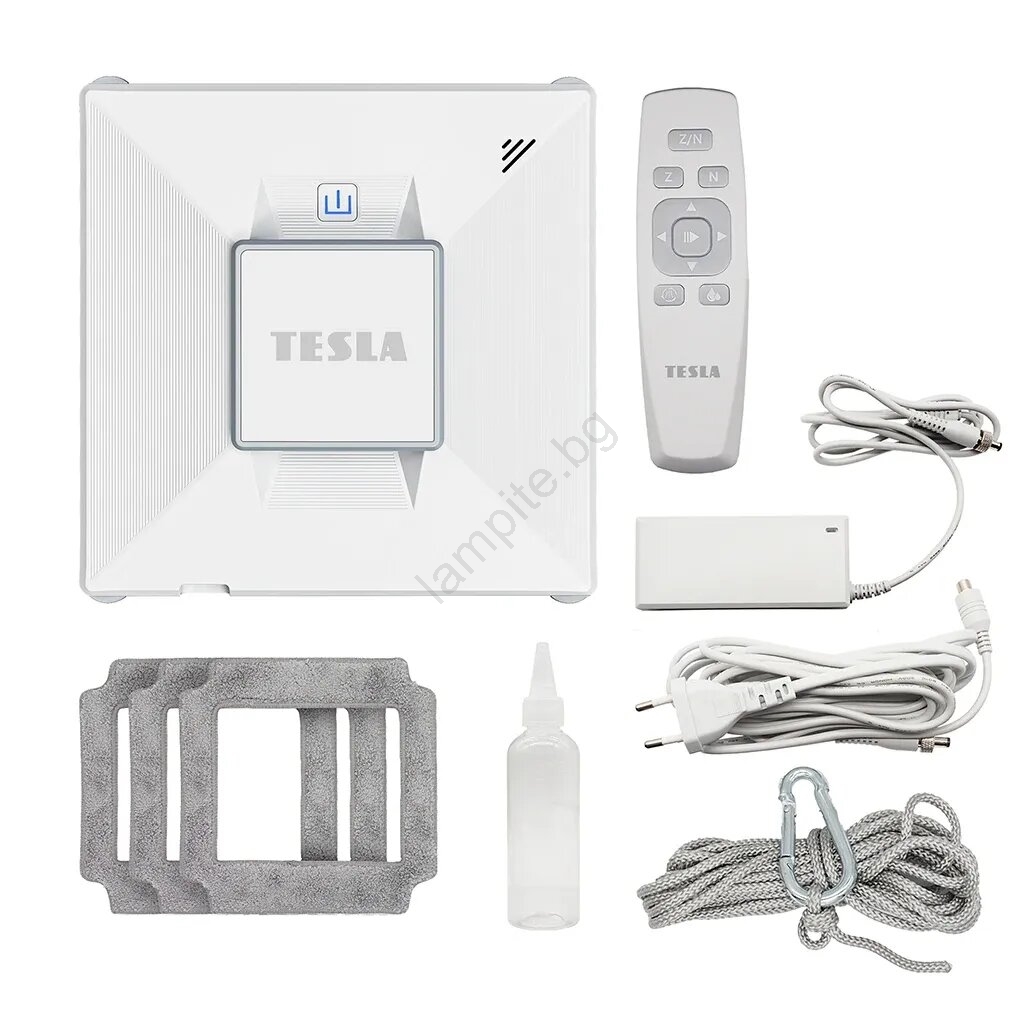 • Комплектът включва: роботизиран почистващ уред за прозорци, почистващ моп от микрофибър (3 бр.), дистанционно управление, пластмасова бутилка за вода, захранващ адаптер 230V, обезопасително въже.