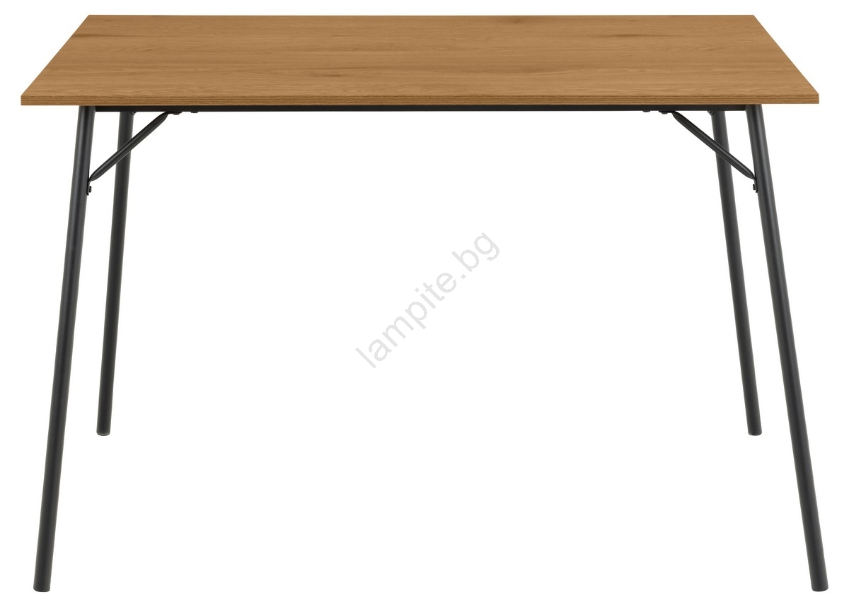• Правоъгълният плот с дъбов декор се поддържа от тънки черни стоманени крака.