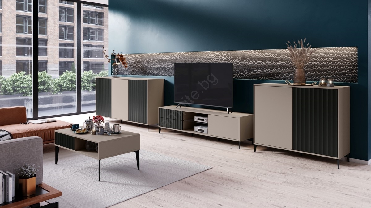 • Минималистичен комплект мебели за всекидневна с изчистени форми и релефни фронтове, които създават уникален и стилен вид.