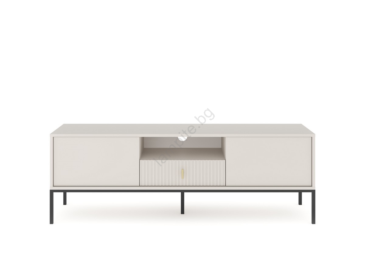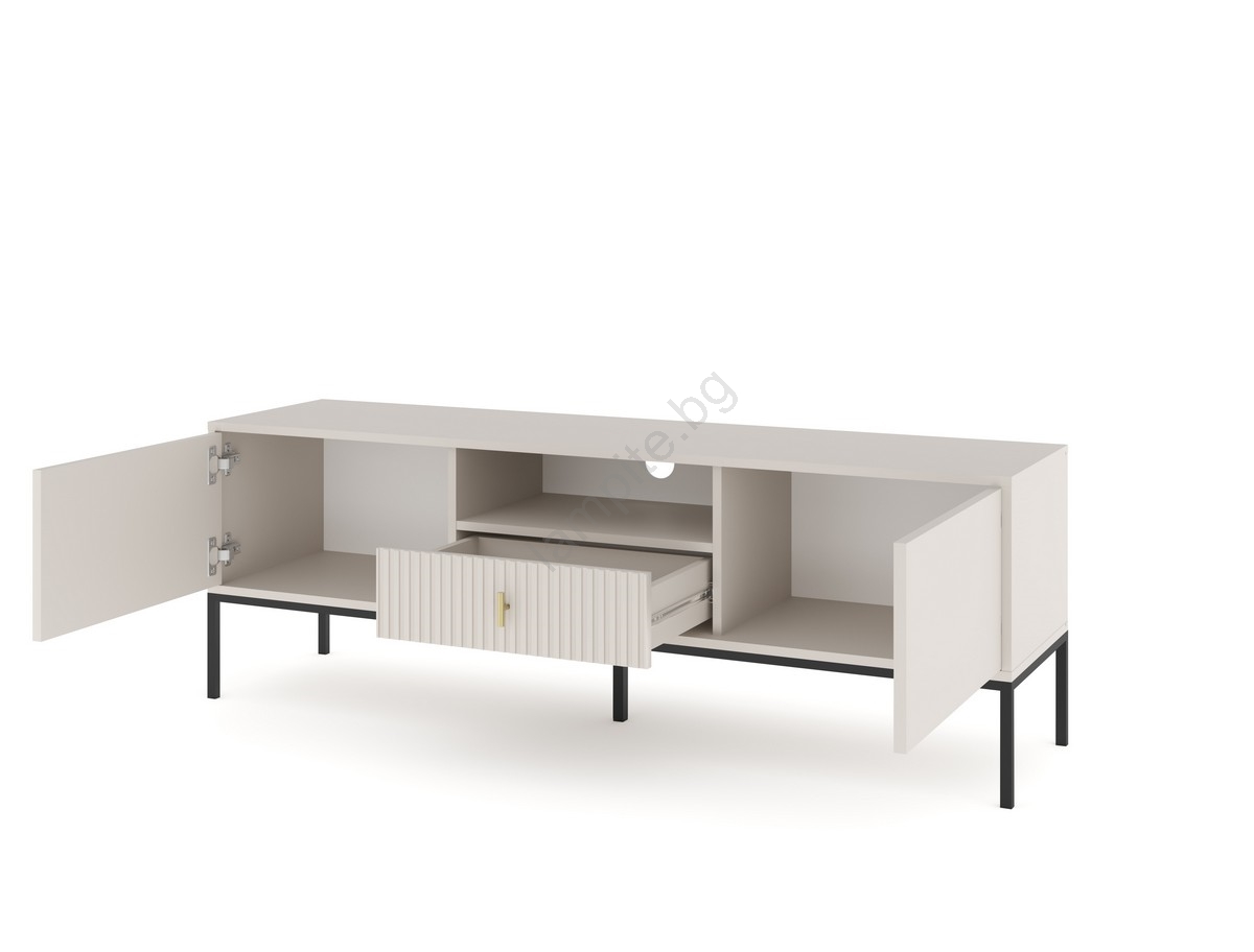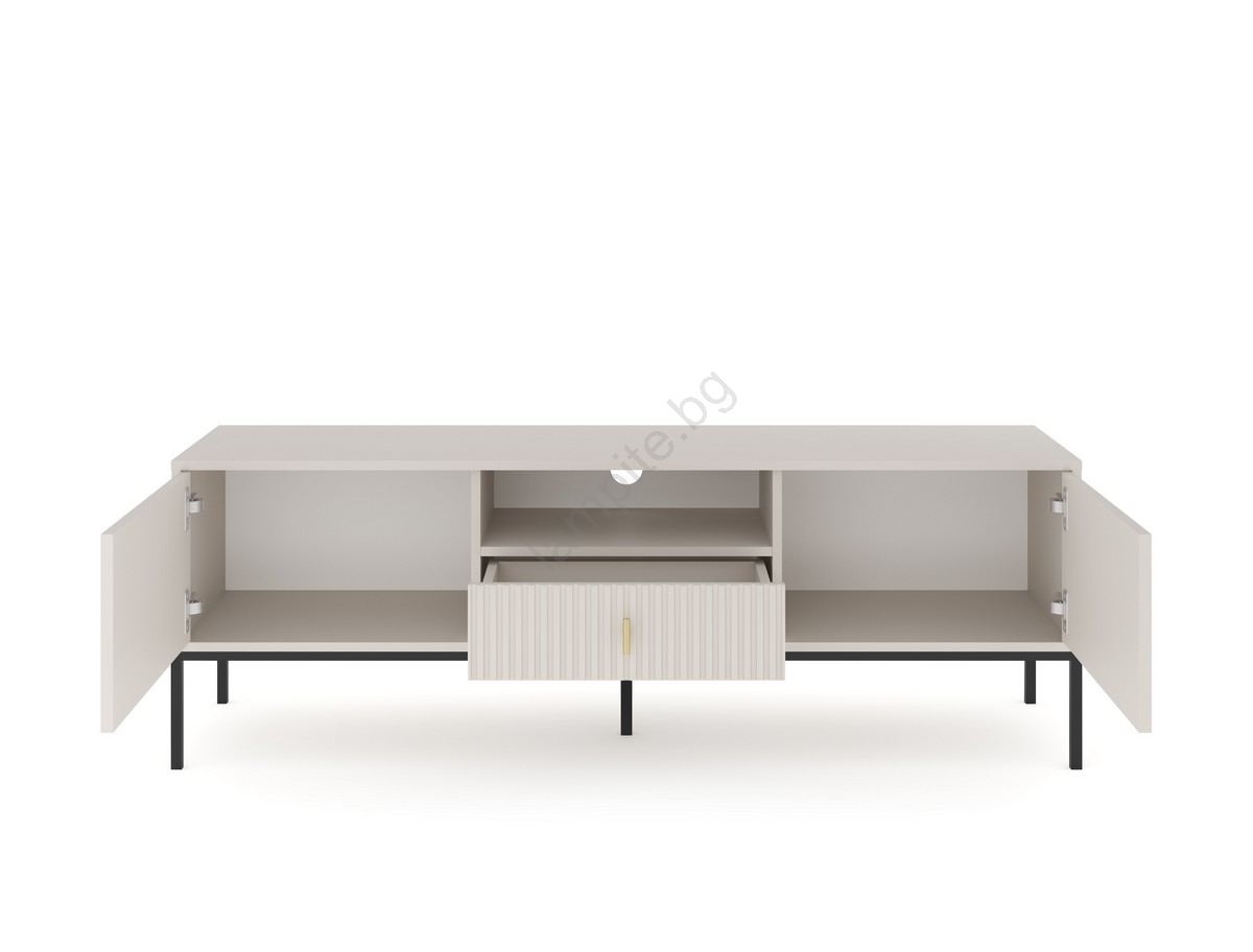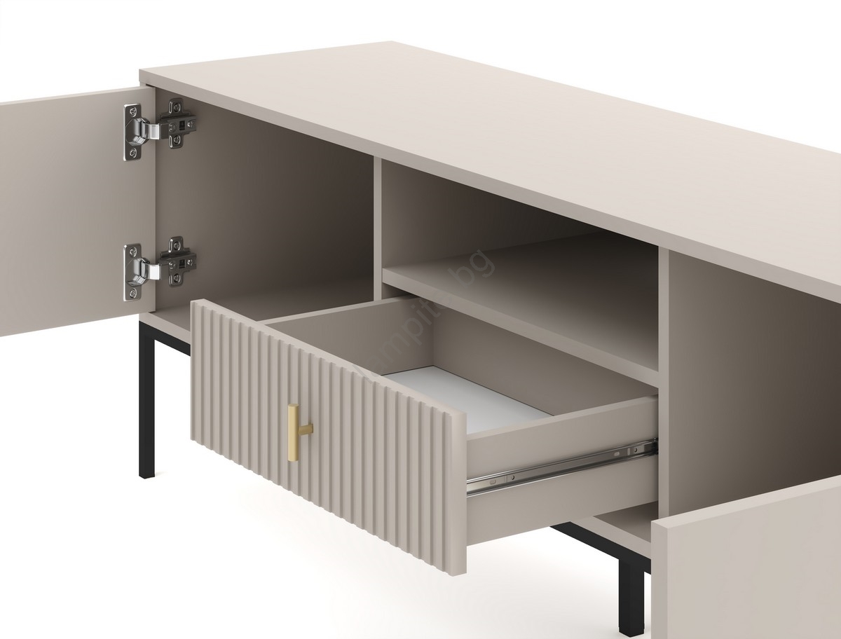 • Разполага с две затворени странични отделения, отворена полица с отвор за кабел в средата и чекмедже под полицата с релефна повърхност.