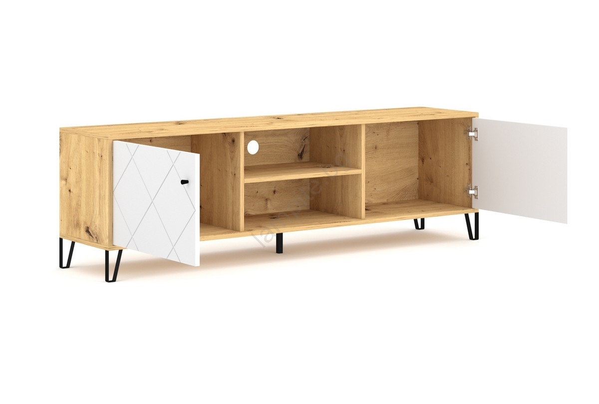 • Разполага с два затворени странични шкафа, всеки с вратички с декоративен диагонален орнамент, и две открити полици с отвор за кабел в средата.