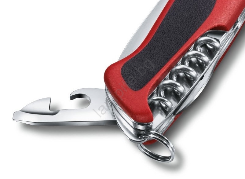 • Оборудван 12 функции: голям нож, трион за дърва, отвертка "Филипс", отварачка за консерви с малка отвертка, отварачка за бутилки с отвертка, резачка за кабели, разширител, шиш, ключодържател от неръждаема стомана, пинсета, клечка за зъби.
