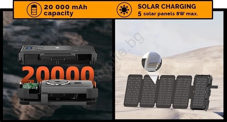 • Благодарение на иновативния сгъваем соларен панел можете да зареждате устройствата си от слънчева светлина, за да имате винаги изцяло зареден телефон, таблет или друга електроника.