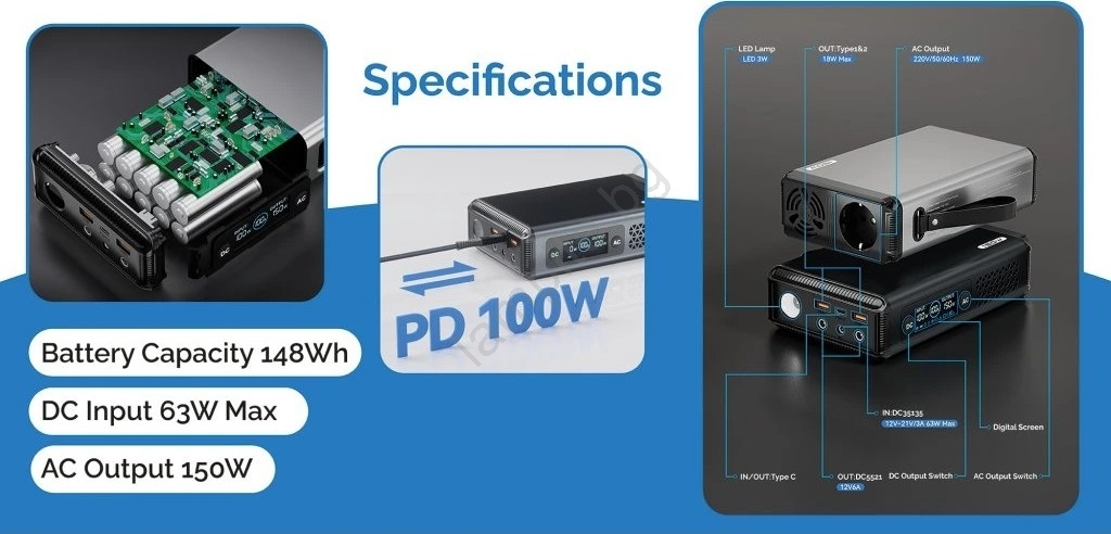 • USB-C вход/изход: 5V/9V/12V/15V/3A, 20V/5A 100W макс.