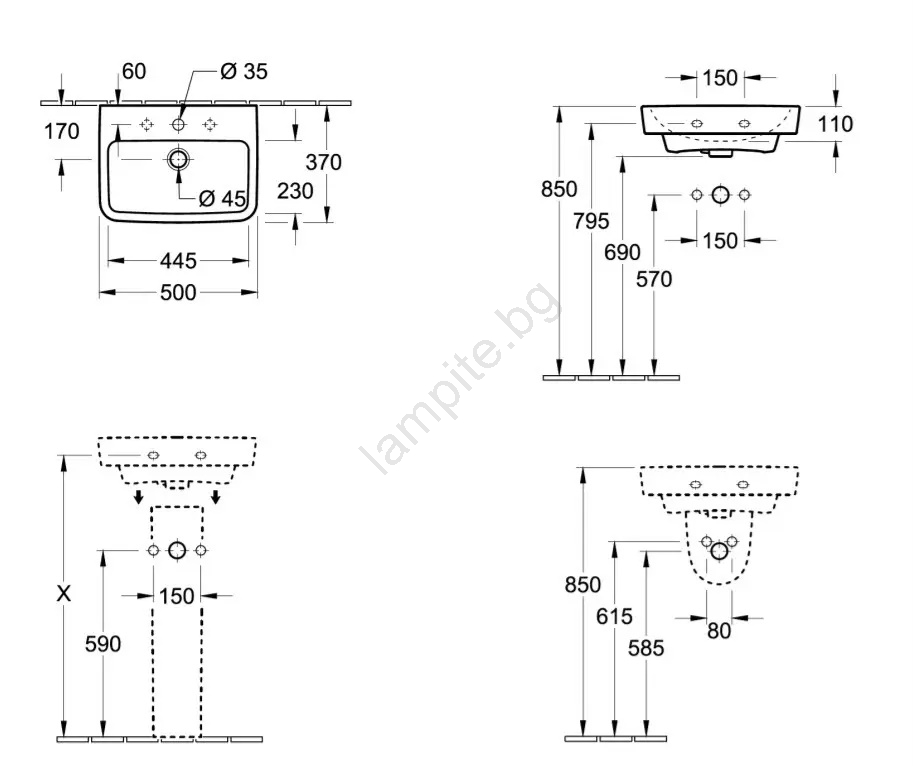 Villeroy & Boch 43445001 - Стенна мивка O.NOVO 50x37 см керамика/бяла