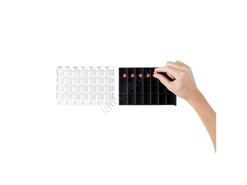 • Органайзерът е разделен на 7 колони (дни от седмицата) и 4 реда (части от деня), което представлява общо 28 отделни отделения.