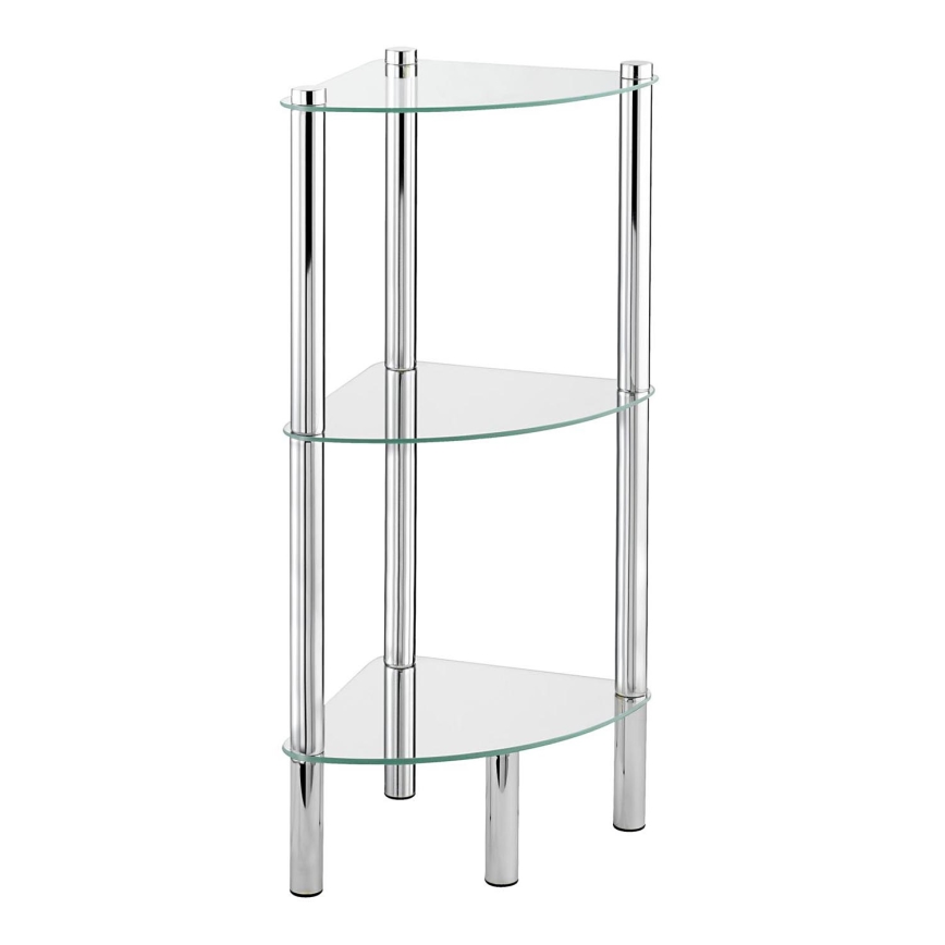 • Елегантен ъглов стелаж с модерен вид от неръждаема стомана и прозрачно стъкло.