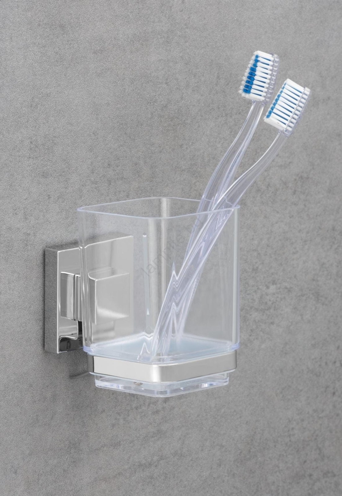 • Практичен държач за четки за зъби със сваляща се прозрачна чаша.