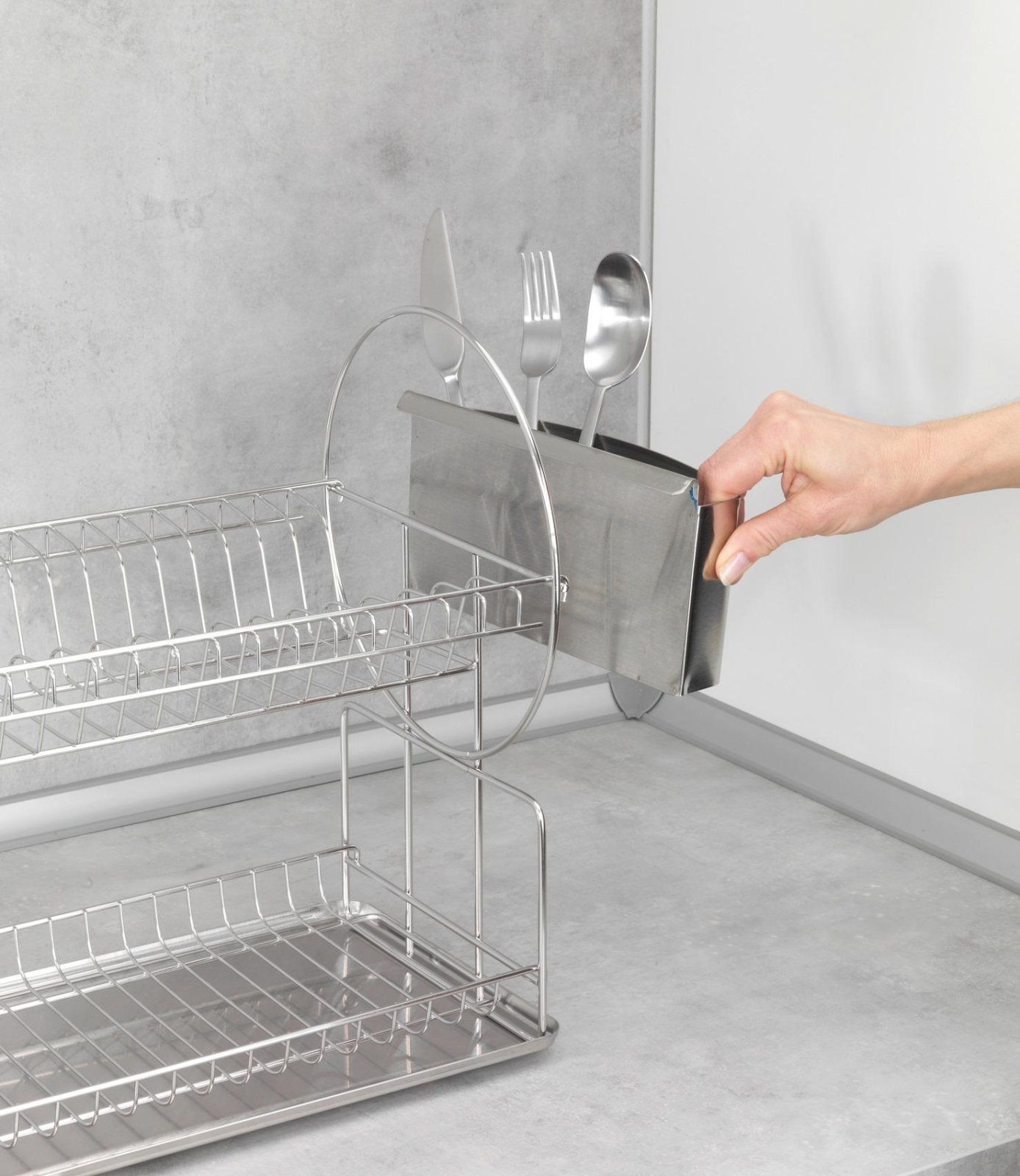 • Практичен кош за прибори, който може да се прикрепи към страната на отцедника.