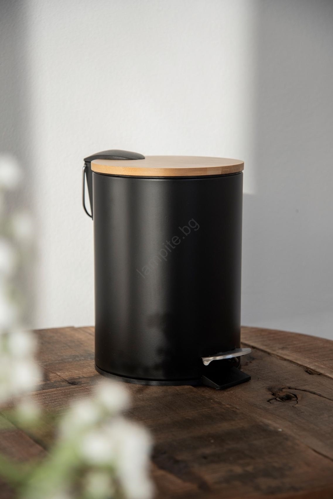 • Елегантен кош за отпадъци с матово черно покритие и бамбуков капак.