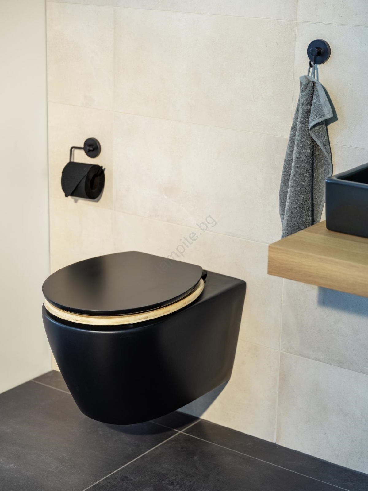 • Стилна тоалетна седалка, съчетание от черен MDF капак и естествено бамбуково седало.