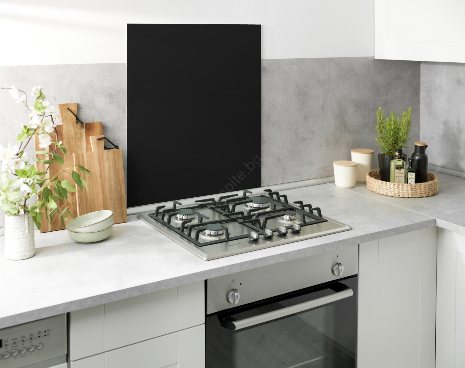 • Елегантен черен стъклен панел придава на кухнята модерен вид.