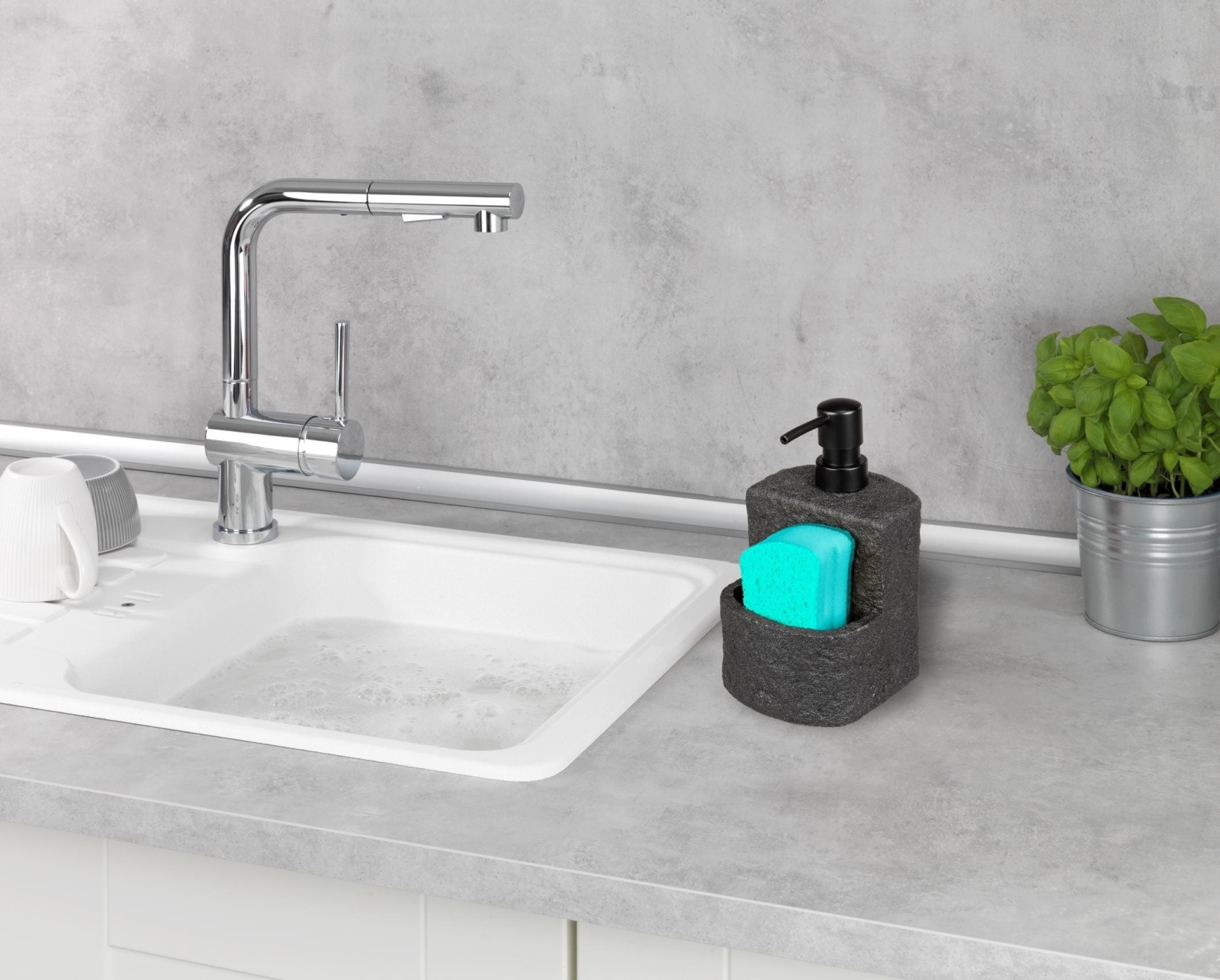 • Съчетава дозатор за препарат и отделение за гъбичка, за винаги подредена мивка.