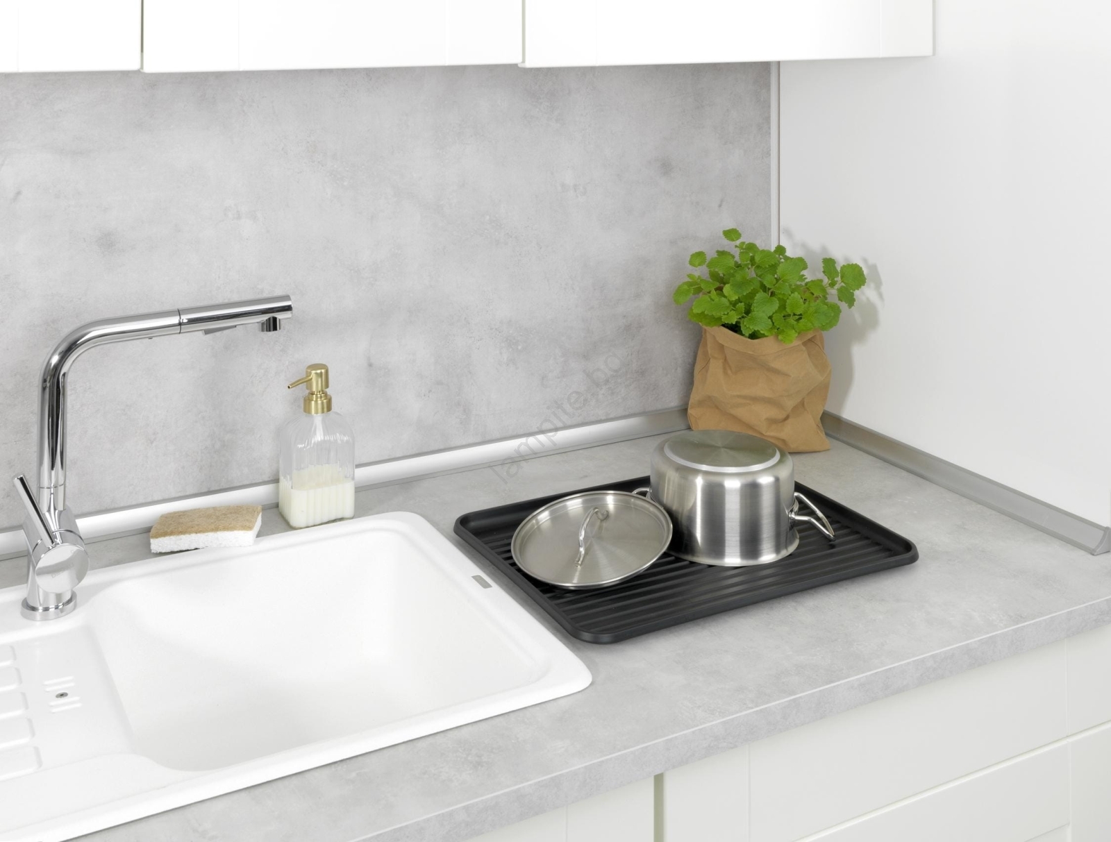 • Сваляема тава за оттичане от рециклирана пластмаса улавя водата и защитава работната повърхност.
