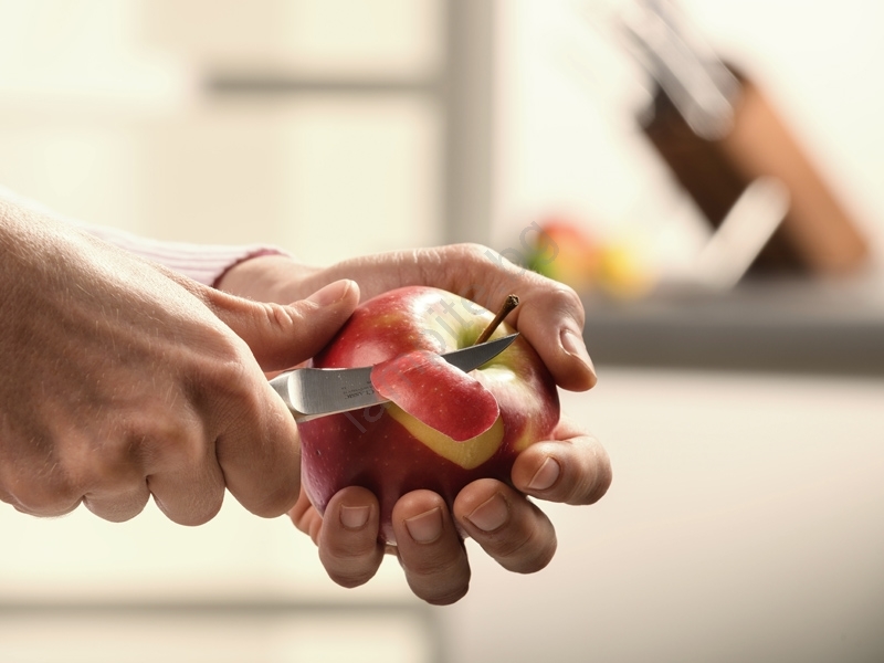 • Специалната форма на ножа за белене е идеална за белене, почистване или изрязване на всякакви плодове или зеленчуци с кръгла повърхност.