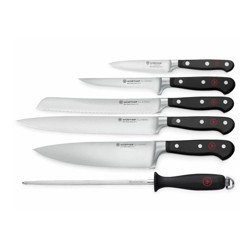 • Опаковката съдържа: нож за рязане 10 см, нож за обезкостяване 14 см, нож за хляб 20 см, нож за разфасоване на месо 23 см, кухненски нож 20 см, точило 23 см.
